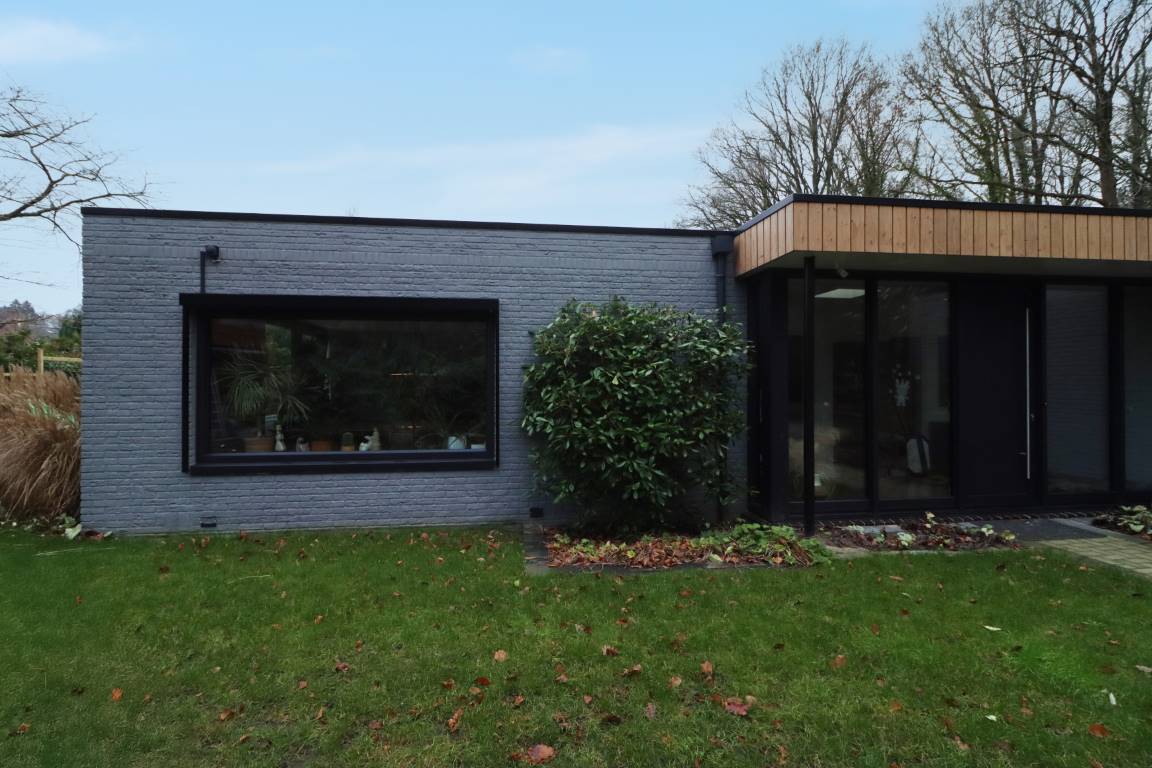 De oorspronkelijke woning – met zijn lage daklijn, grijze baksteen en kleine raampartijen – bood weinig verbinding met de omliggende natuur en voldeed niet langer aan de woonwensen van deze tijd. In de nieuwe situatie is gekozen voor een complete architectonische herinterpretatie: een expressief volume met een steile kap, bekleed met verticale houten geveldelen en voorzien van diepe, donkere raamkaders.