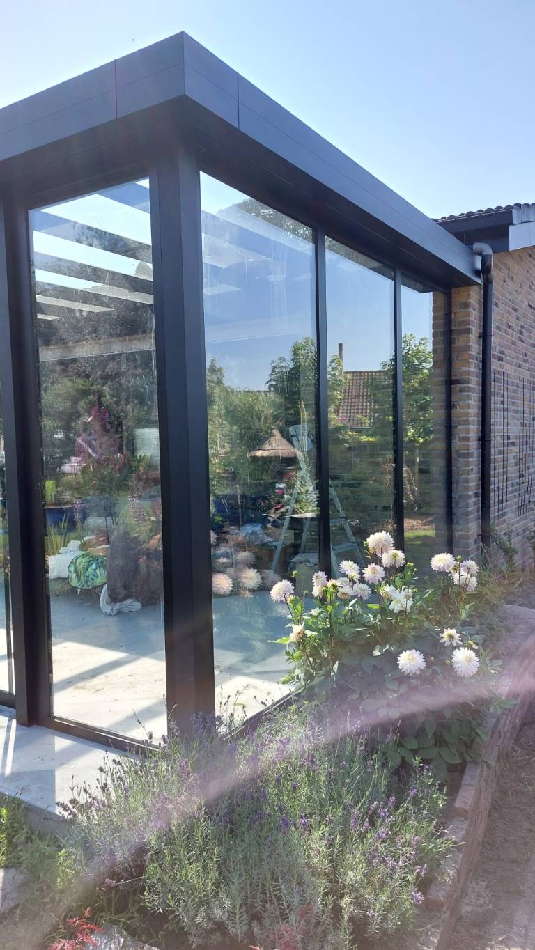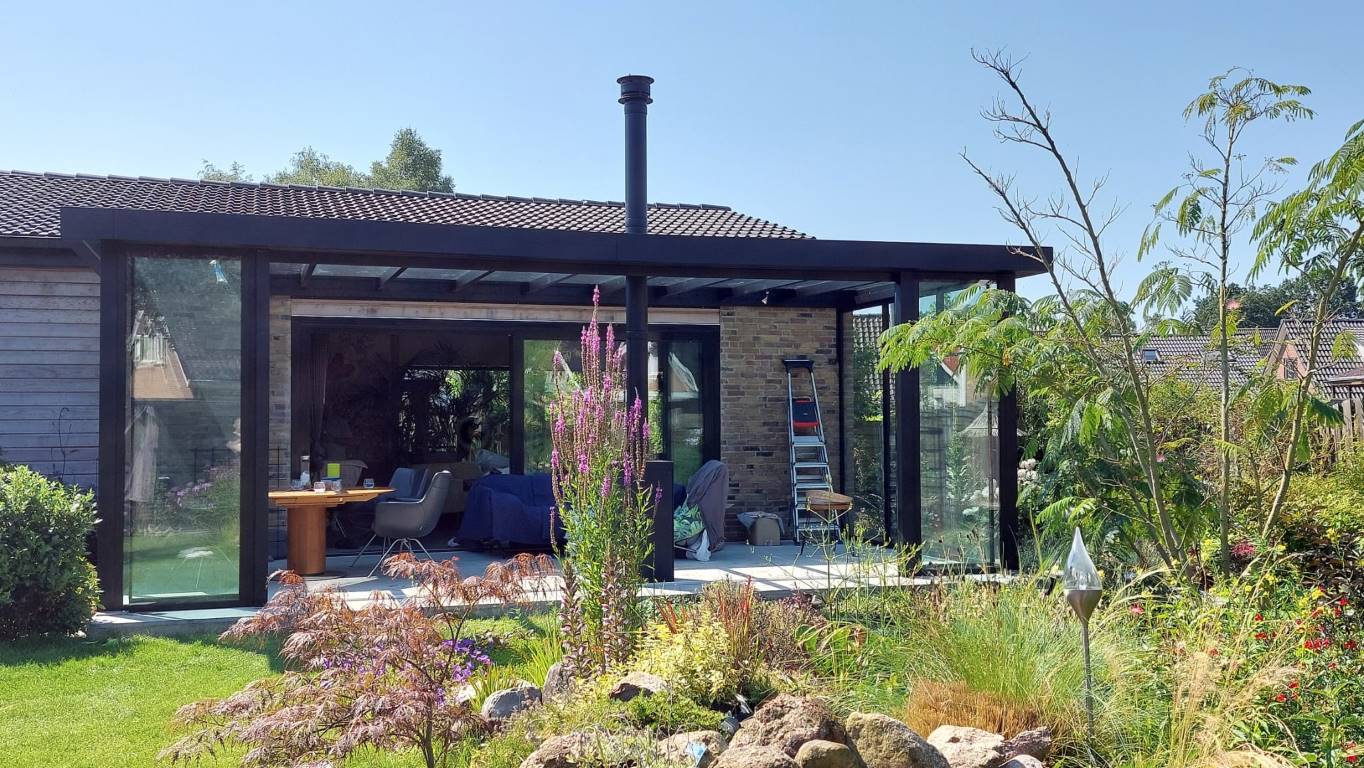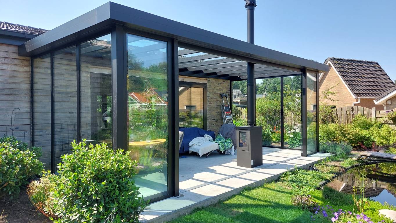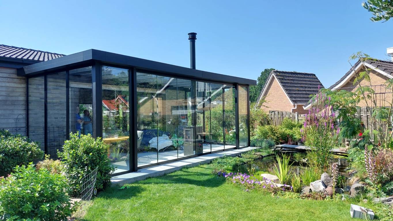 Moderne tuinkamer in Weiteveen, nieuw gebouwd door bouwbedrijf Kuper en Kroeze uit Emmen. Een stijlvolle uitbreiding met glazen schuifwanden en houtkachel, perfect voor optimaal buitenleven in elk seizoen.